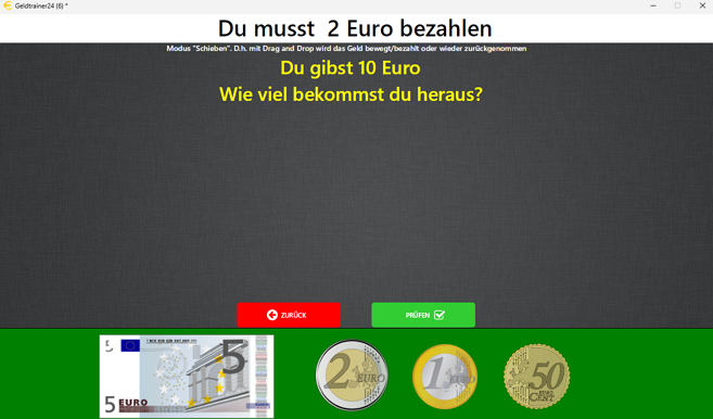 Vorgegebene Geldbeträge von 10 Cent (Summe) bis 1000 Euro werden gezählt