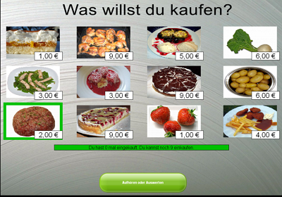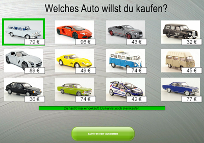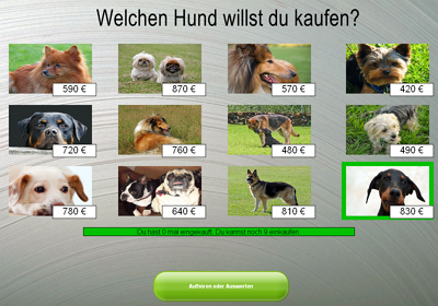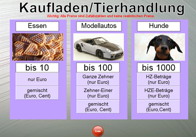 Einkaufen (Lebensmittel bis 10 Euro, Modellautos bis 100 Euro, Hunde bis 1000 Euro)