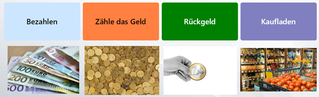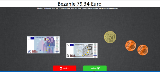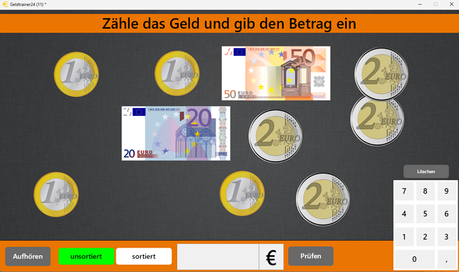 Vorgegebene Geldbeträge von 10 Cent (Summe) bis 1000 Euro werden gezählt