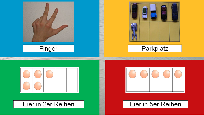 - Im Programm werden mit verschiedenen Bildinhalten, Finger, Parkplatz/Autos, Eierbecher in 2er und 5er Anordnung Mengen dargestellt. Und zwar immer nur kurz, der Schüler soll möglichst üben, diese ohne Abzählen zu erfassen